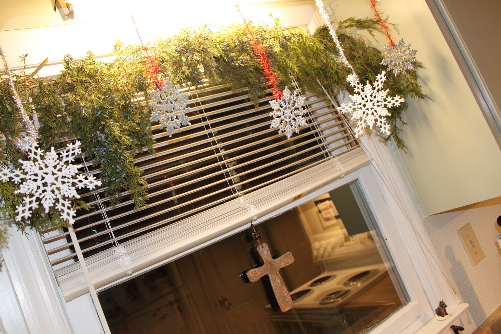 | Rather than putting away all my everyday treasures that adorn our mantel, I decided to leave them out and adorn them with pine garland with berries that I score at Hobby Lobby. |